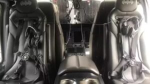 Assim, os bancos de couro para os passageiros são preto e tem o símbolo do Batman na parte superior, onde a pessoa que estiver sentada coloca a cabeça.