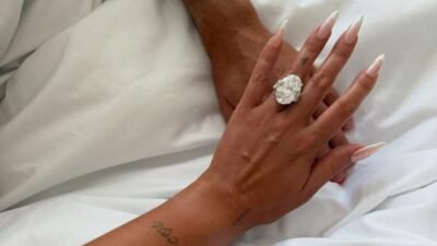 O anel entregue à noiva está avaliado em até US$ 15 milhões (cerca de R$ 82 milhões na cotação atual). Composta por três diamantes que somam 40 quilates, a peça tem valor comparável ao de um superesportivo raro.