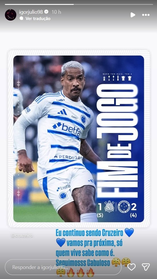 O zagueiro Igor Julio, do Brighton, mostrou apoio ao Cruzeiro após a eliminação para o Corinthians na semifinal da Copa do Brasil. O defensor de 27 anos é declaradamente torcedor da Raposa.