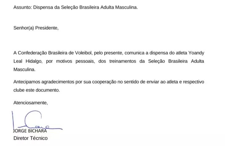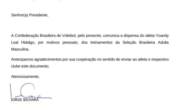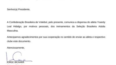 Uma nota assinada pelo diretor técnico da CBV, Jorge Bichara, comunica a dispensa de Leal “por motivos pessoais dos treinamentos da Seleção Brasileira Adulta Masculina”.