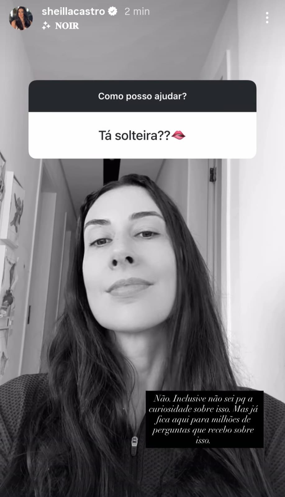 Sheilla completou: “Inclusive não sei por que a curiosidade sobre isso. Mas já fica aqui para milhões de perguntas que recebo sobre isso”.