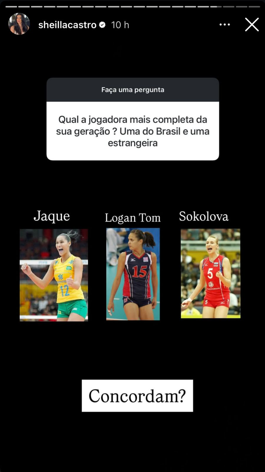 No Instagram, Sheilla abriu uma caixinha de perguntas, em que os seguidores podem questioná-la sobre qualquer assunto. Uma das questões dizia: “Qual a jogadora mais completa da sua geração? Uma do Brasil e outra estrangeira”