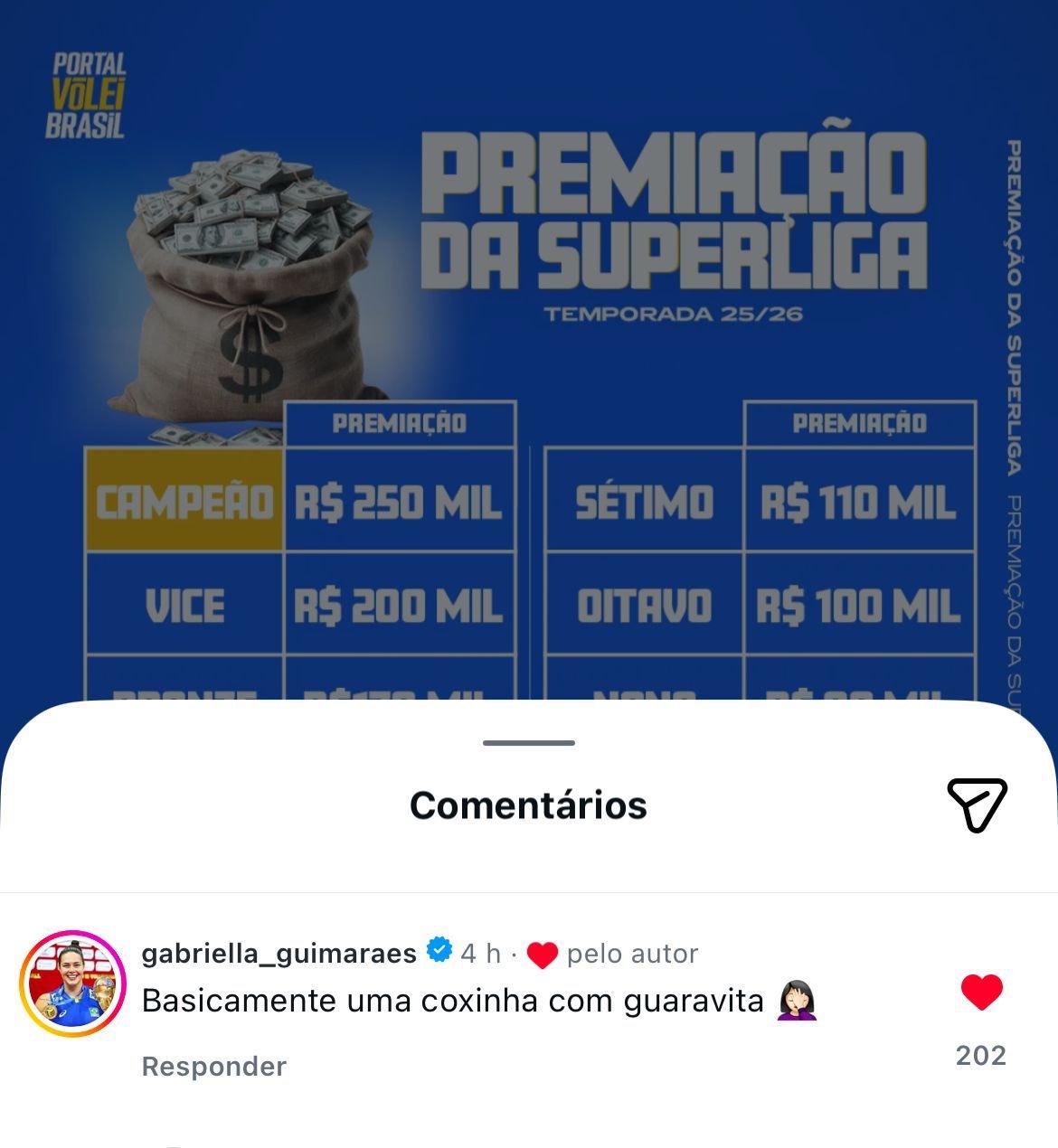 A ponteira Gabriella Guimarães, a Gabiru, de 31 anos, ironizou a premiação da Superliga Feminina de Vôlei em um comentário feito no perfil do Portal do Vôlei no Instagram. Atualmente no Mackenzie, a jogadora criticou os valores pagos aos clubes.