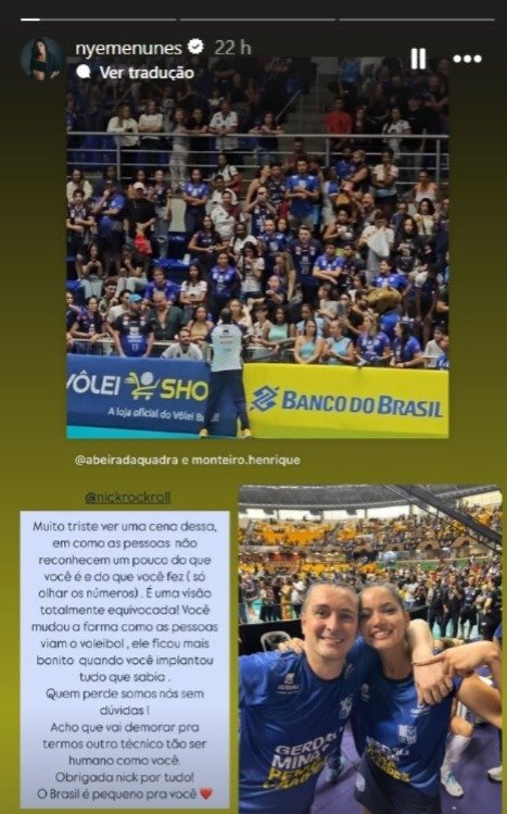 “Quem perde somos nós, sem dúvidas! Acho que vai demorar para termos outro técnico tão ser humano como você. Obrigada, Nick, por tudo! O Brasil é pequeno para você”, finalizou, em post no story de sua conta pessoal no Instagram.