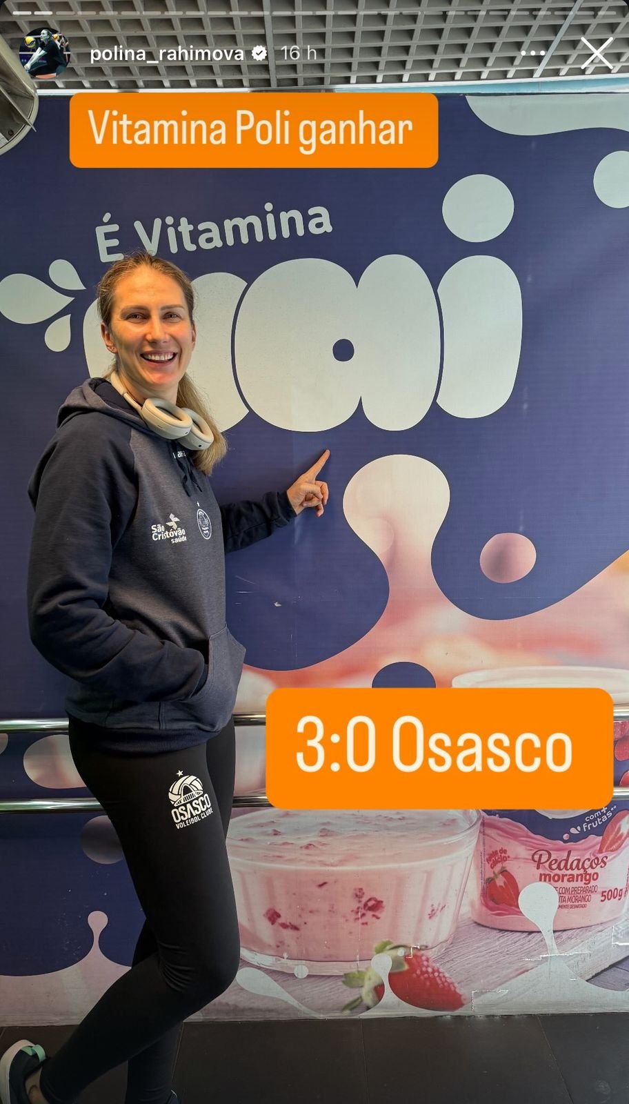 Em suas redes sociais, ela publicou uma foto ao lado de uma placa de um dos patrocinadores do Minas e escreveu: “vitamina Poli ganhou”. Polina também ressaltou o placar: “3:0 Osasco”, completou.