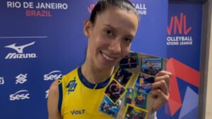 A levantadora e capitã da Seleção Brasileira Feminina de Vôlei passou pela zona mista após a vitória por 3 sets a 2 sobre a Alemanha, no sábado (7/6), com um item personalizado nas mãos. Enquanto falava com jornalistas, a mão esquerda da atleta segurava uma folha parda com diversas fotos de diferentes momentos da carreira.