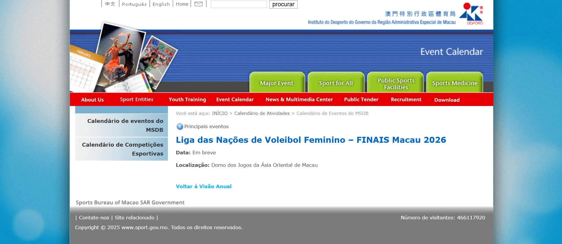 Na página de “principais eventos”, foi colocada a fase final – quartas, semi e final – da Liga das Nações Feminina de Vôlei de 2026, que ocorrerá entre 22 e 26 de julho. O local que receberá os jogos também foi confirmado: o Macau East Asian Games Dome, ginásio esportivo coberto que recebe outros esportes no país asiático.